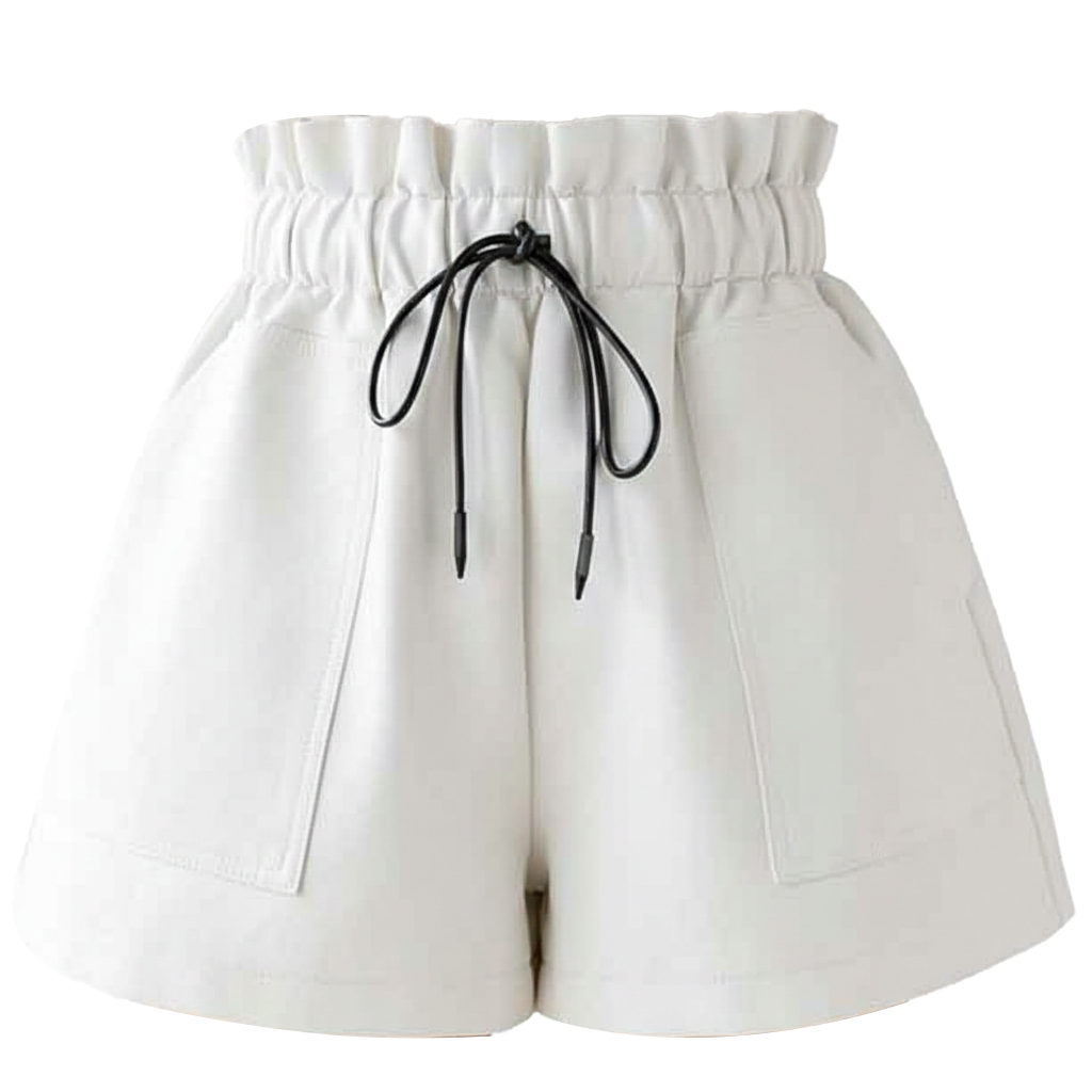 White Leather Women’s Shorts – High Waist Drawstring Elastic Waist Casual Streetwear Shorts