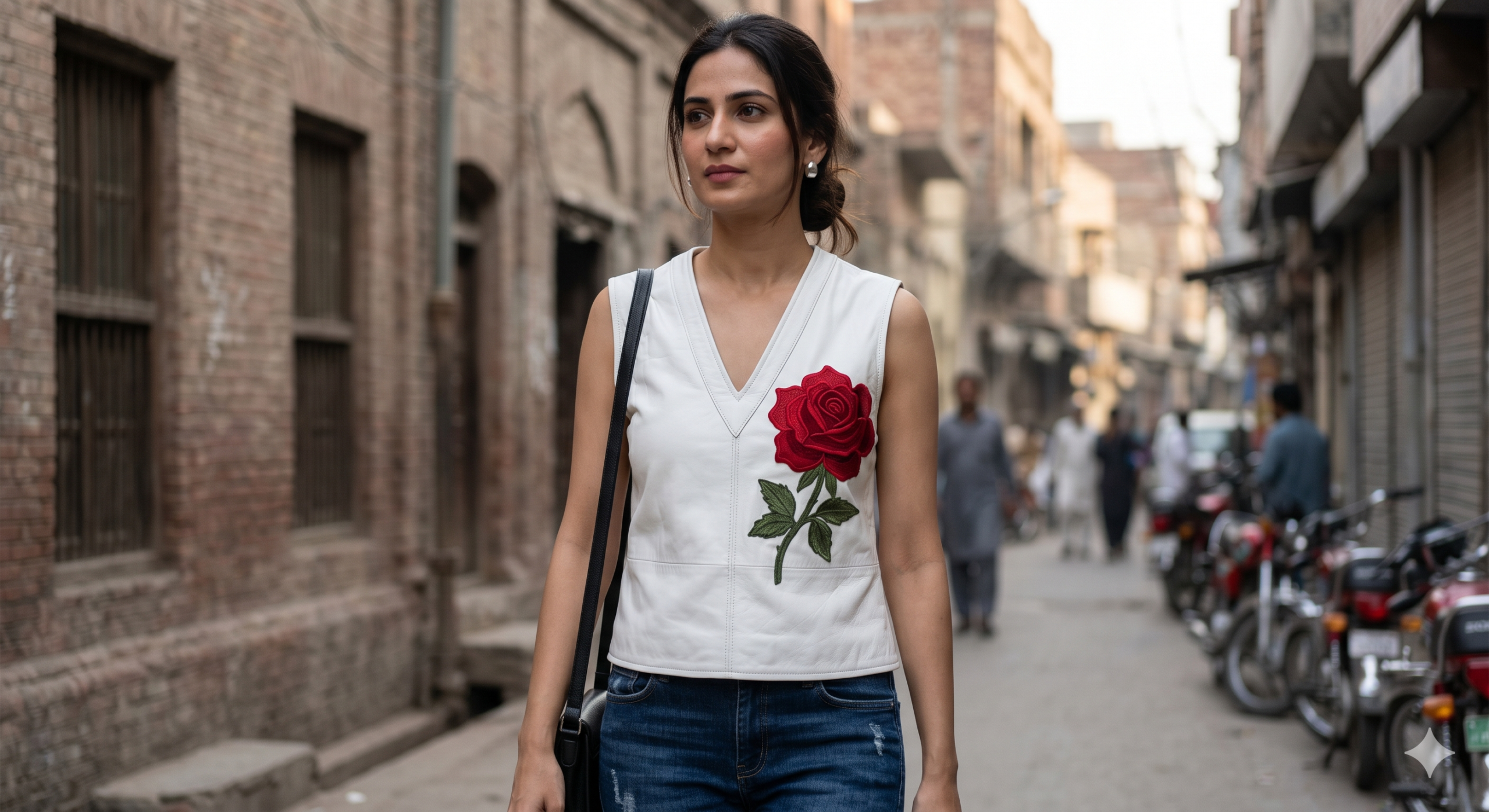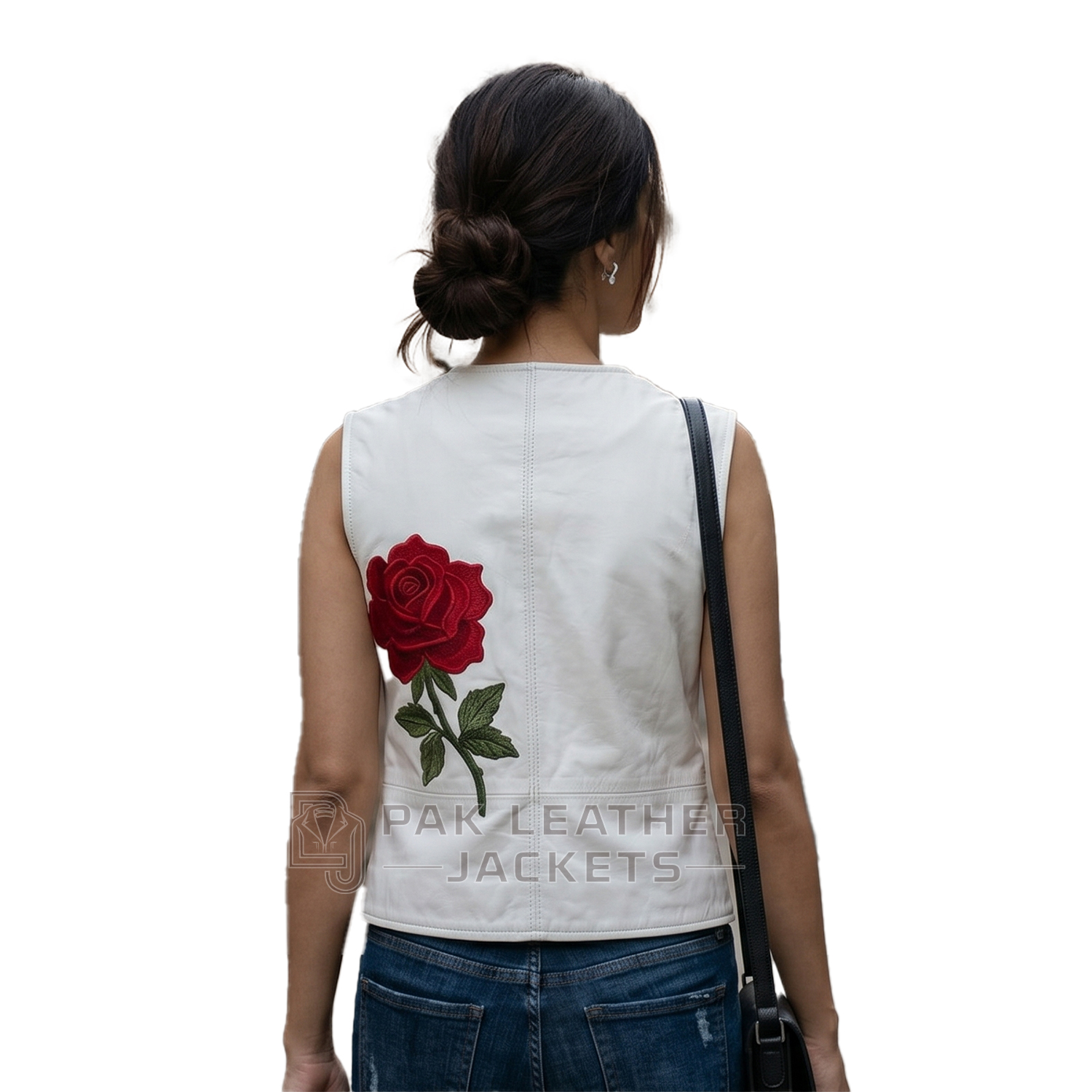- Elegant sleeveless leather vest featuring a stylish V-neck design and beautiful rose embroidery detail. Crafted from high-quality faux leather for a sleek and modern look. Perfect for casual wear, street style, or layering with your favorite outfits. Comfortable, trendy, and eye-catching design ideal for any season.